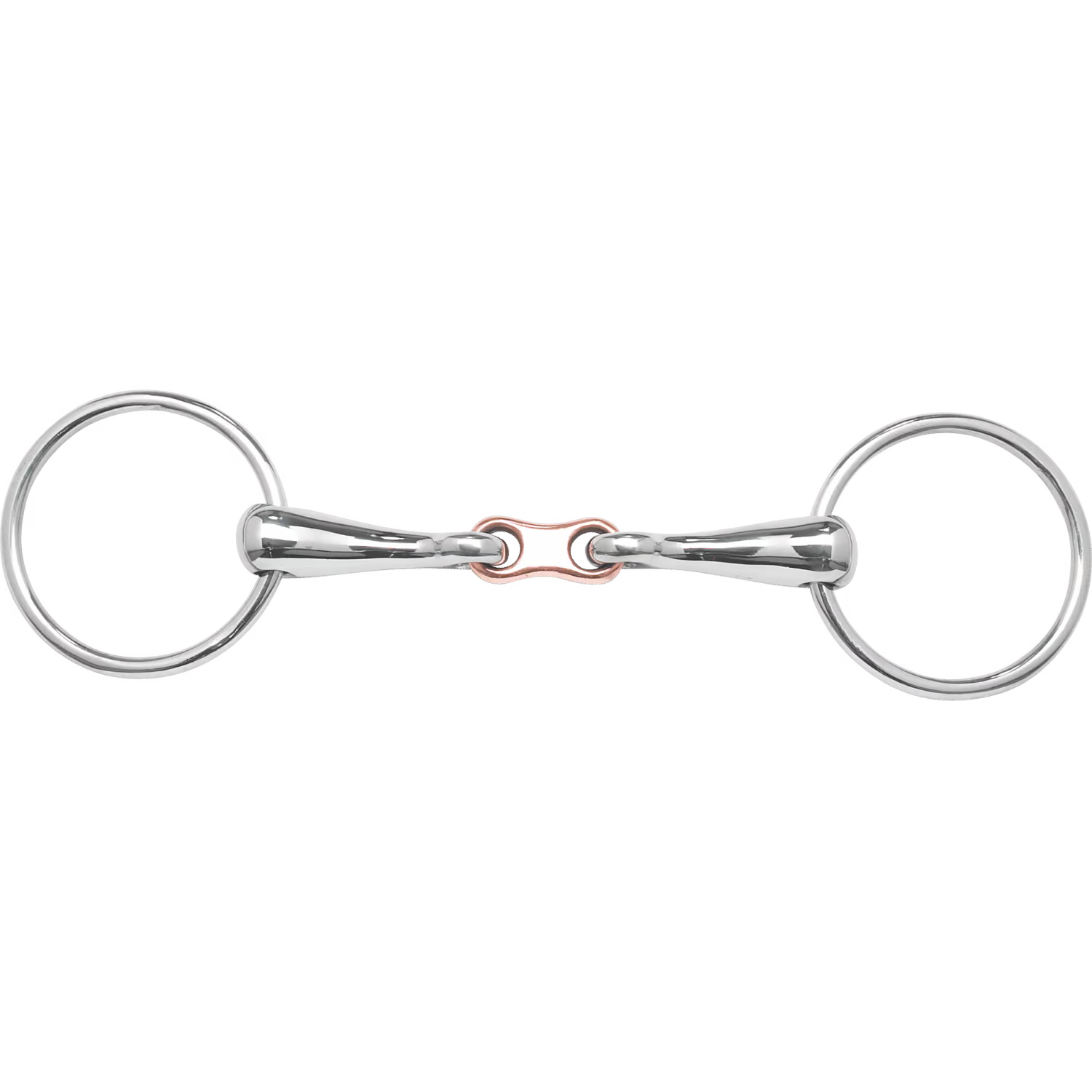 Das doppelt gebrochene Mundstück mit French Link (flachem Mittelstück) liegt gleichmäßig auf der Zunge auf und sorgt für eine sanfte Druckverteilung ohne Gaumendruck. Das Kupferelement fördert die Kautätigkeit, Speichelbildung und die Akzeptanz des Gebisses, wodurch eine weiche, vertrauensvolle Verbindung zwischen Pferd und Reiterhand entsteht.