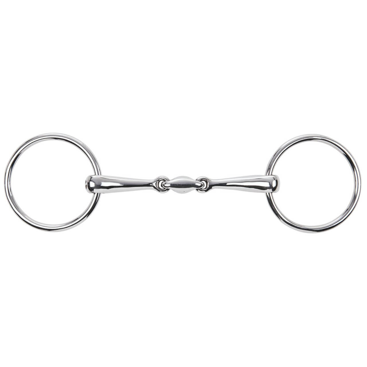 Das doppelt gebrochene Mundstück besteht aus drei flexiblen Teilen, wodurch der Druck gleichmäßig auf Zunge und Laden verteilt wird. So wird der empfindliche Gaumen geschont und die Kautätigkeit sowie die Losgelassenheit des Pferdes gefördert. Das Gebiss liegt ruhig im Maul und sorgt für eine harmonische, direkte Zügelverbindung.