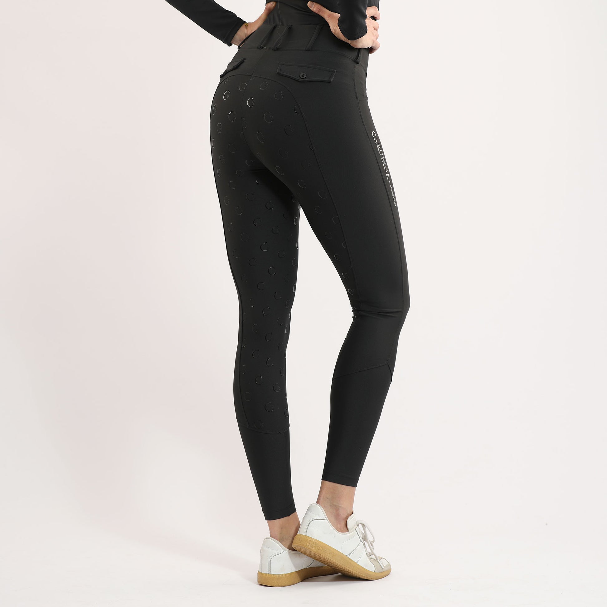 Der Silikon-Vollbesatz (Fullgrip) sorgt für sicheren Halt im Sattel und unterstützt eine stabile Sitzposition, während der hohe, elastische Bund für eine optimale Passform und eine schöne Silhouette sorgt. Praktische Seitentaschen bieten Platz für Smartphone oder kleine Accessoires, und dezente Carubina-Logo-Details runden den sportlich-eleganten Look ab.