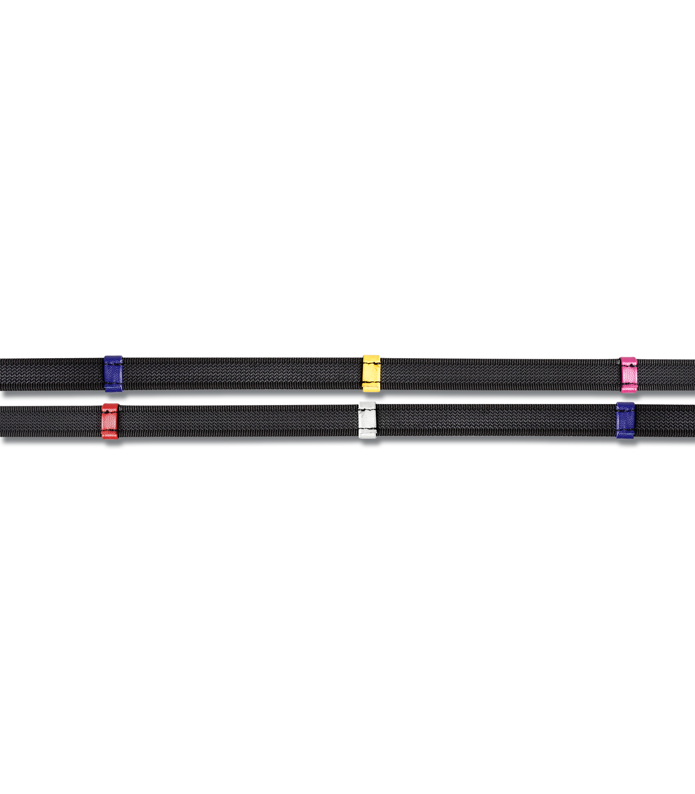 Dank der eingearbeiteten Gummierung bieten die Zügel eine hervorragende Griffigkeit – auch bei Nässe – und liegen angenehm in der Hand. Die bunten Stege erleichtern die Zügelmaßkorrektur und helfen dabei, die Zügellänge konstant zu halten – perfekt für Reiter in der Ausbildung oder das tägliche Training.