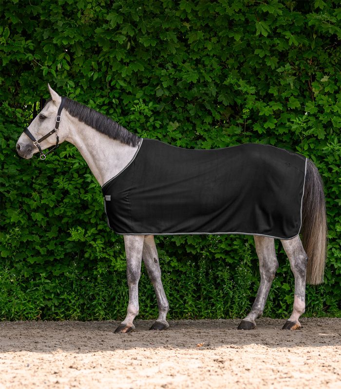 Das hochwertige Fleecematerial sorgt für schnellen Feuchtigkeitstransport, sodass dein Pferd nach der Arbeit zügig abtrocknet, ohne auszukühlen. Die Decke liegt angenehm am Pferdekörper an und ist mit einem einfachen Frontverschluss und schweifseitigen Kordeln ausgestattet, damit sie sicher sitzt.